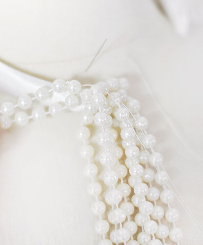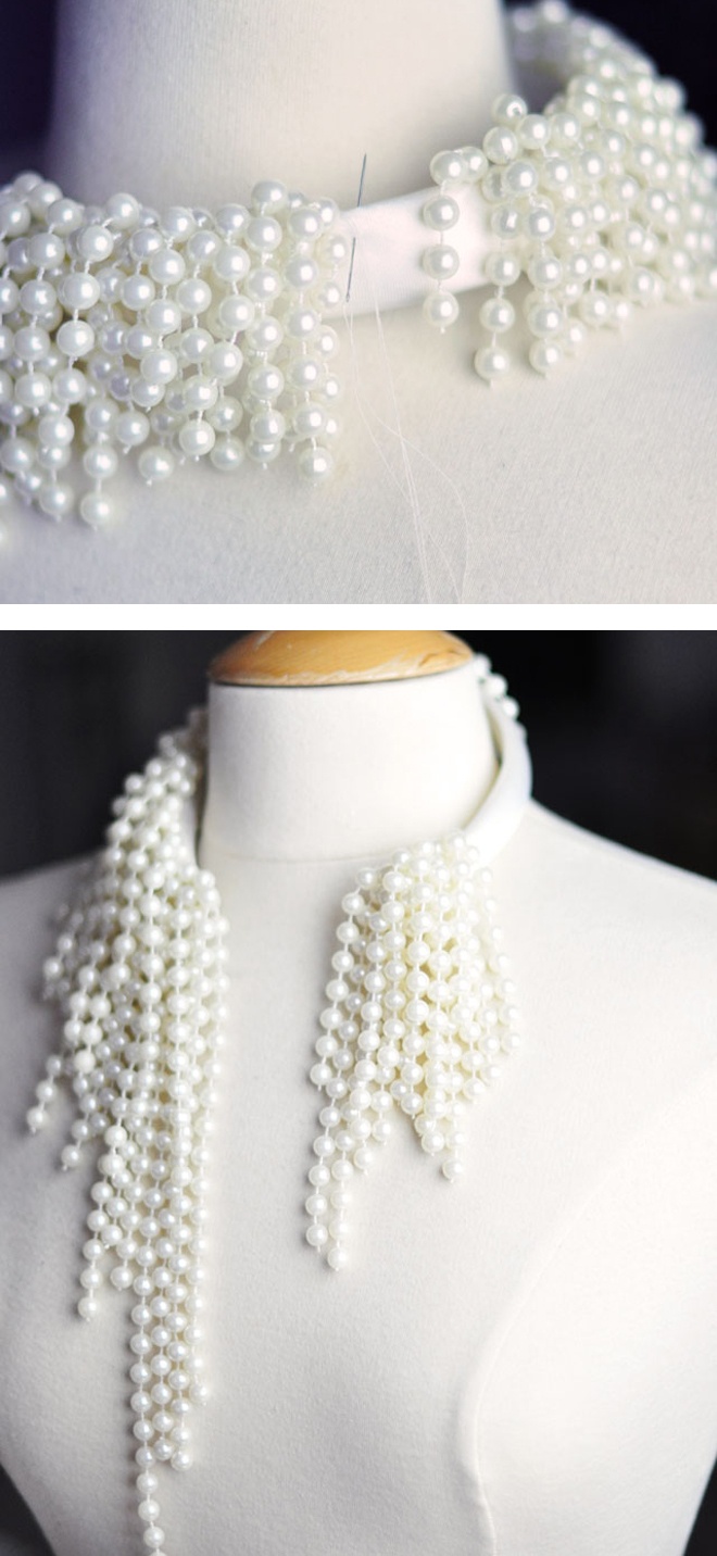 | Tiếp tục khâu như thế với các sợi dây cườm còn lại, và nhớ là phần dây ngọc trai phía sau lưng sẽ luôn ngắn hơn phần buông rủ xuống trước ngực đúng như kiểu dáng những sợi dây chuyền Dior. |
