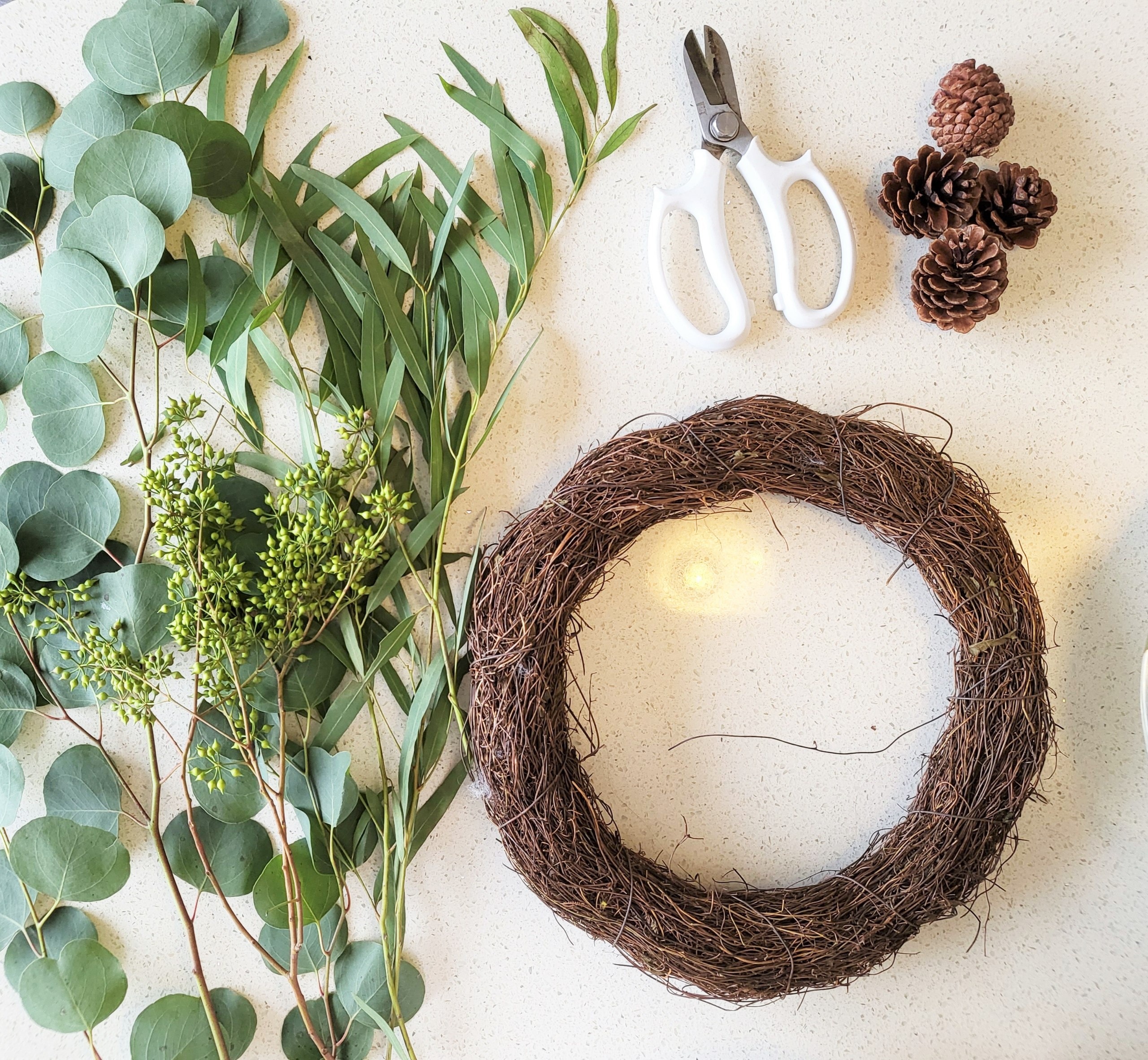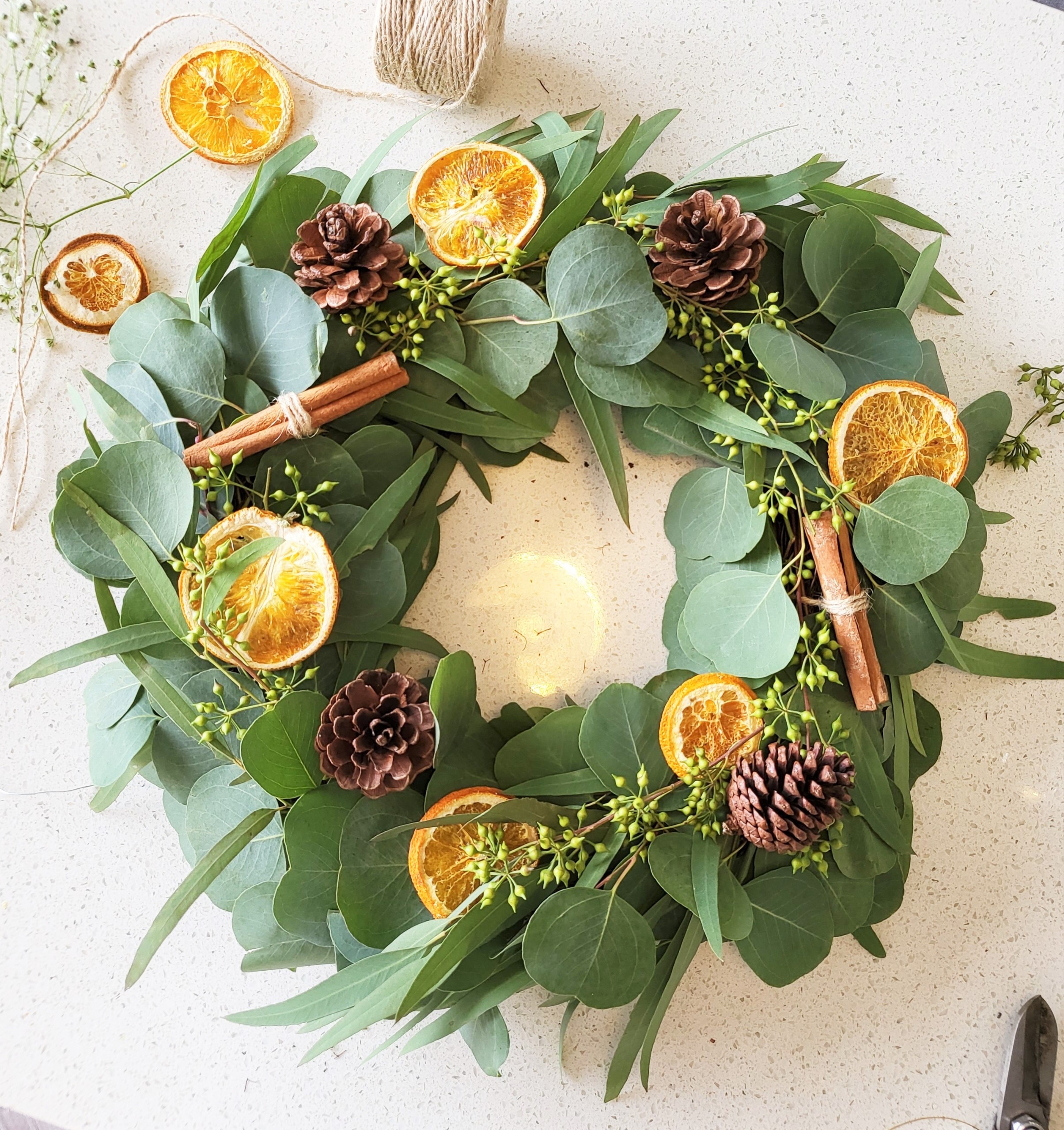 Không dùng thông, tôi lựa chọn các loại lá tươi thuộc họ khuynh diệp có mùi hương dịu nhẹ để làm thành chiếc vòng nguyệt quế trang trí tại nhà cho mùa Giáng sinh năm nay.