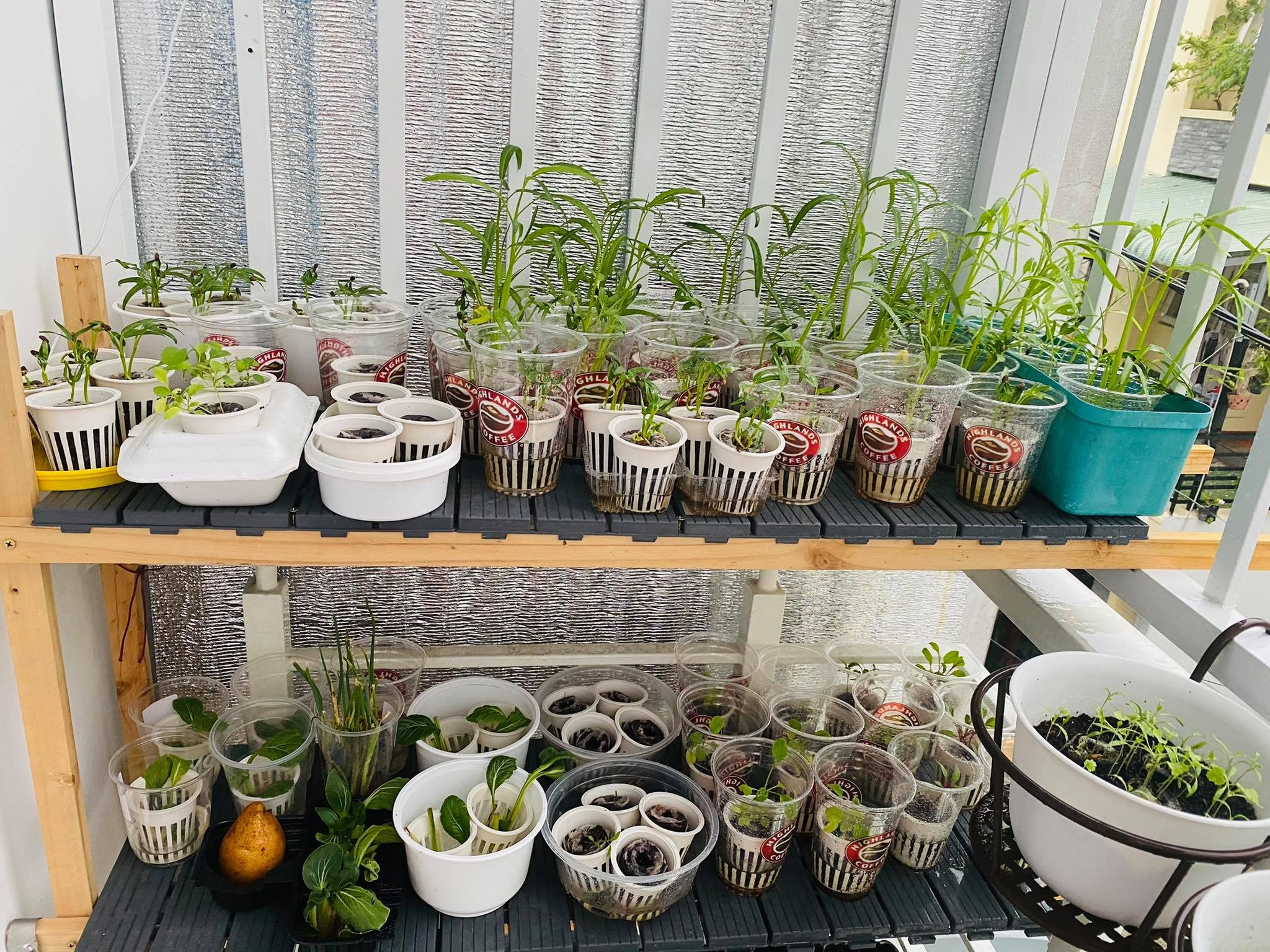 Tận dụng những ly nhựa, vỏ chai, lon sữa cũ,... trong nhà, nhiều gia đình đã tái chế lại thành đồ dùng cho khu vườn nhỏ của mình.