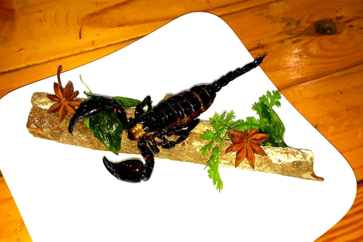 Bày bọ cạp chiên giòn lên nhánh quế khô, trang trí cùng ngò rí, húng quế. Khi ăn chấm kèm muối tiêu chanh rất ngon.