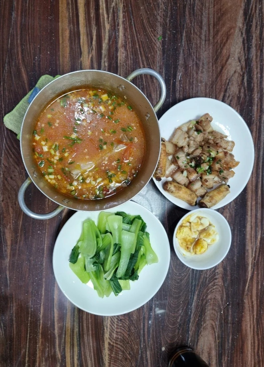 Trong quá trình thực hiện bữa ăn, anh phải gọi video với bạn để được hướng dẫn từng bước. Mâm cơm gồm rau luộc, thịt kho và canh cà chua của Trọng Nhân mất gần 3 giờ đồng hồ để hoàn thành.
