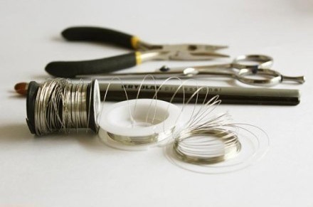 Một cuộn dây thép mềm, một chiếc bút có thân hình tròn, kìm cắt thép, kéo sắt
