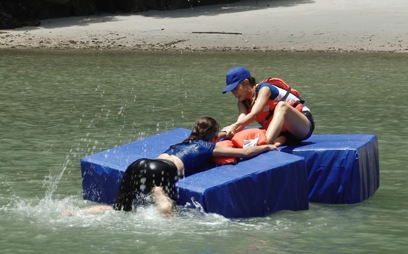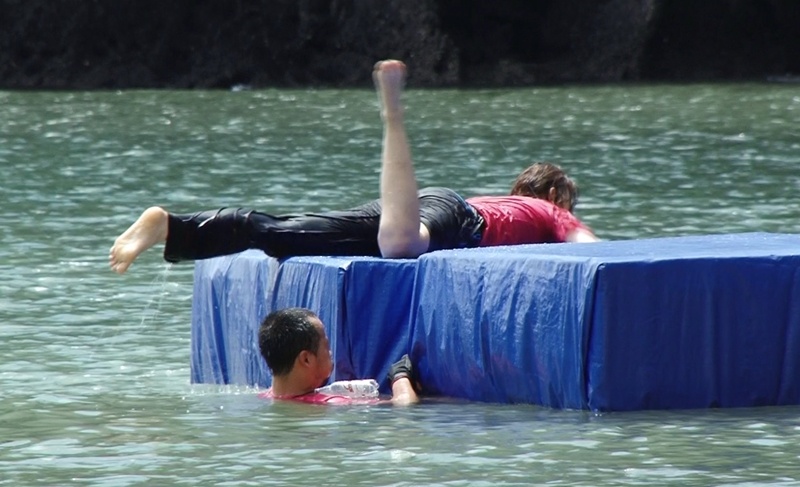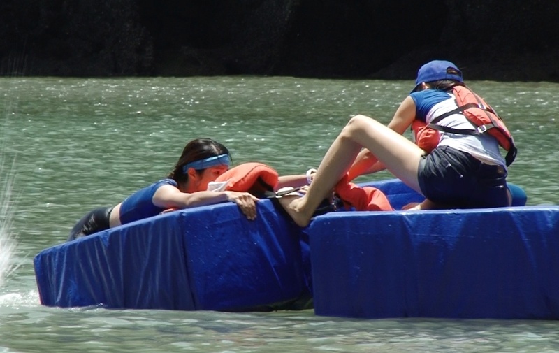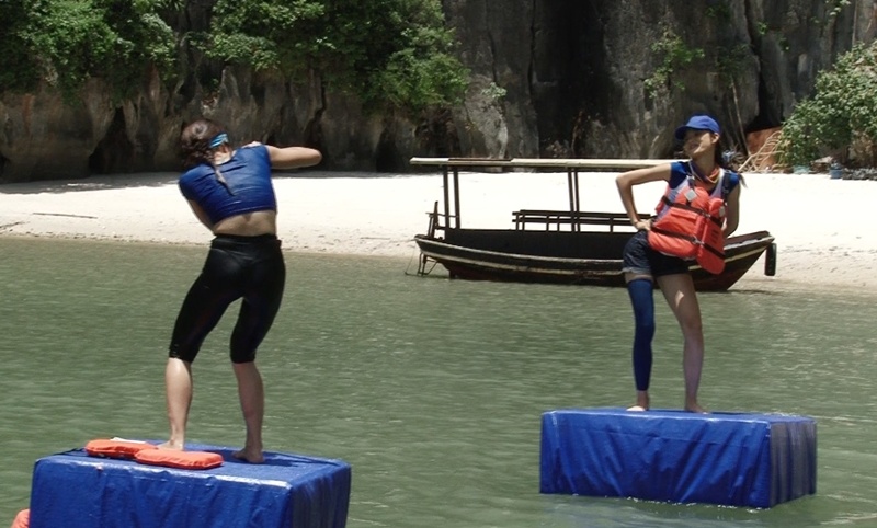 Hai cô gái Xanh dương với lợi thế chân dài nhưng cũng bị té và phao lật úp lên người kha khá lần, cuối cùng mới có thể lên được trên cầu phao