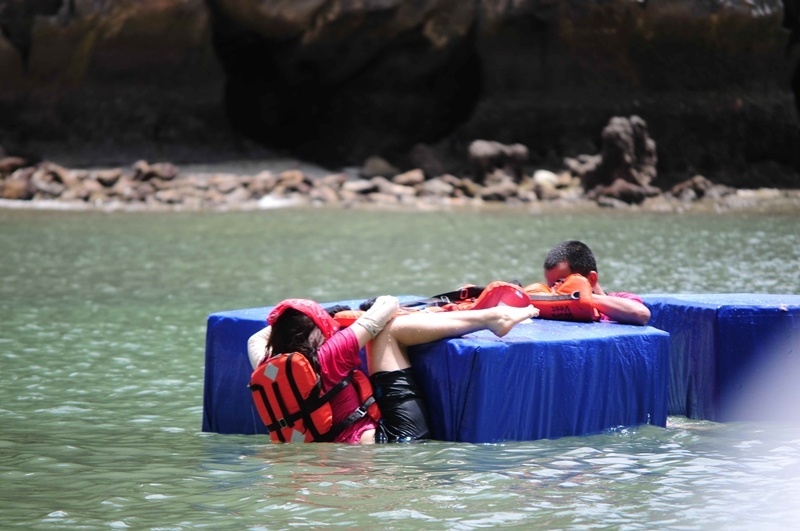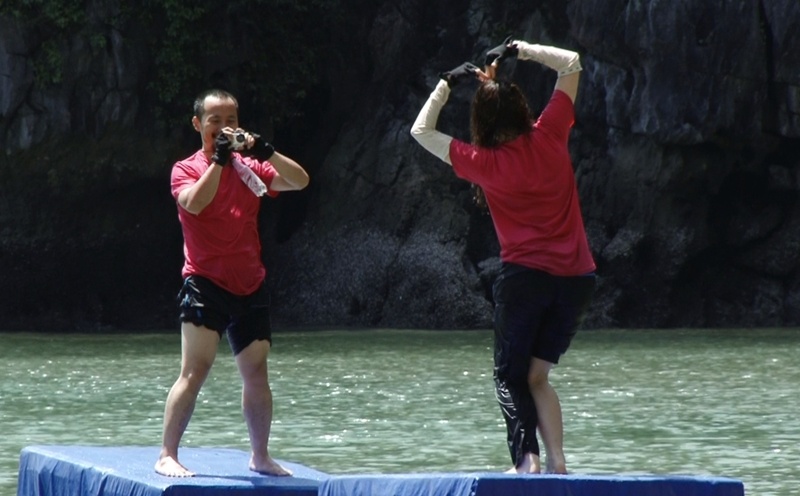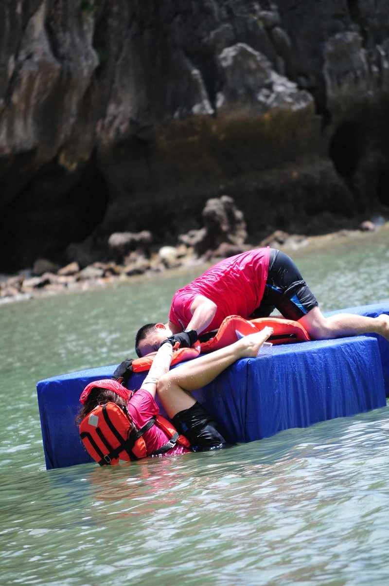 Tiến Đạt và Hari phải vất vả bầm dập để leo lên được trên phao.