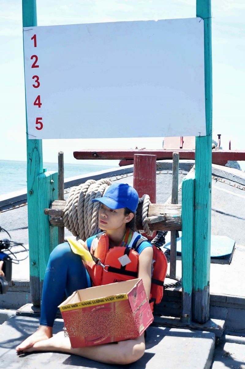 Diệp Lâm Anh phải tìm mọi cách leo, trèo, trườn, lê để lên được trên phao.