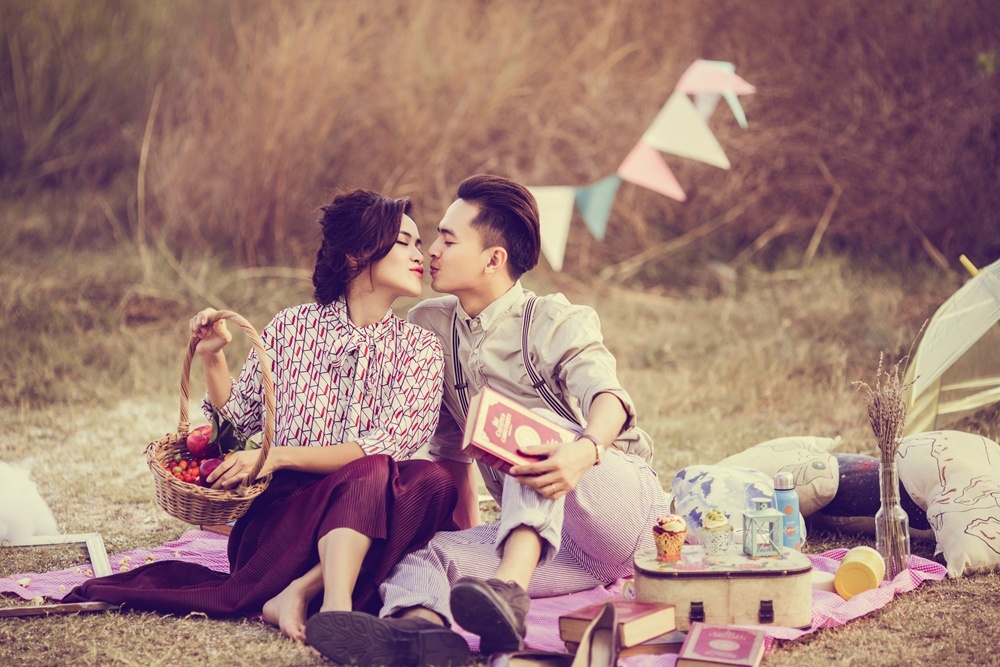 | Trong các thiết kế phong cách thập niên 1970, Tú Vi - Văn Anh hóa thân thành cặp tình nhân cổ điển, ngọt ngào. |