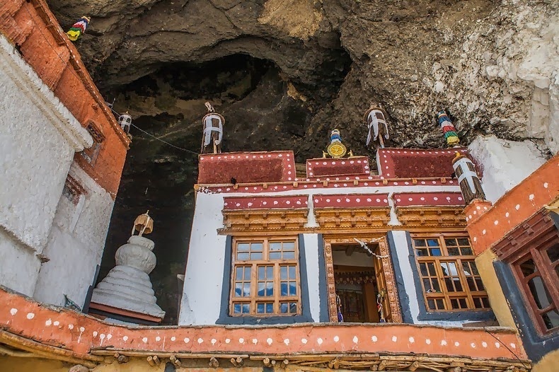 | Tu viện là một công trình bằng bùn và gỗ độc đáo được xây ở lối vào của một hang động tự nhiên trên vách đá cao của một hẻm núi thuộc một bên nhánh chính của con sông Lungnak (Lingti-Tsarap). |