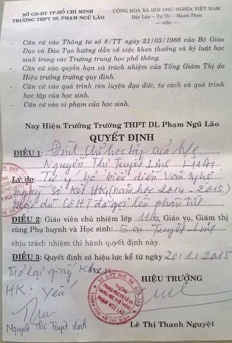 Trước đó, ngày 20/1, trên mạng xã hội bàn tán về một quyết định đình chỉ học tập "lạ" của trường THPT dân lập Phạm Ngũ Lão, quận Gò Vấp, TP HCM.