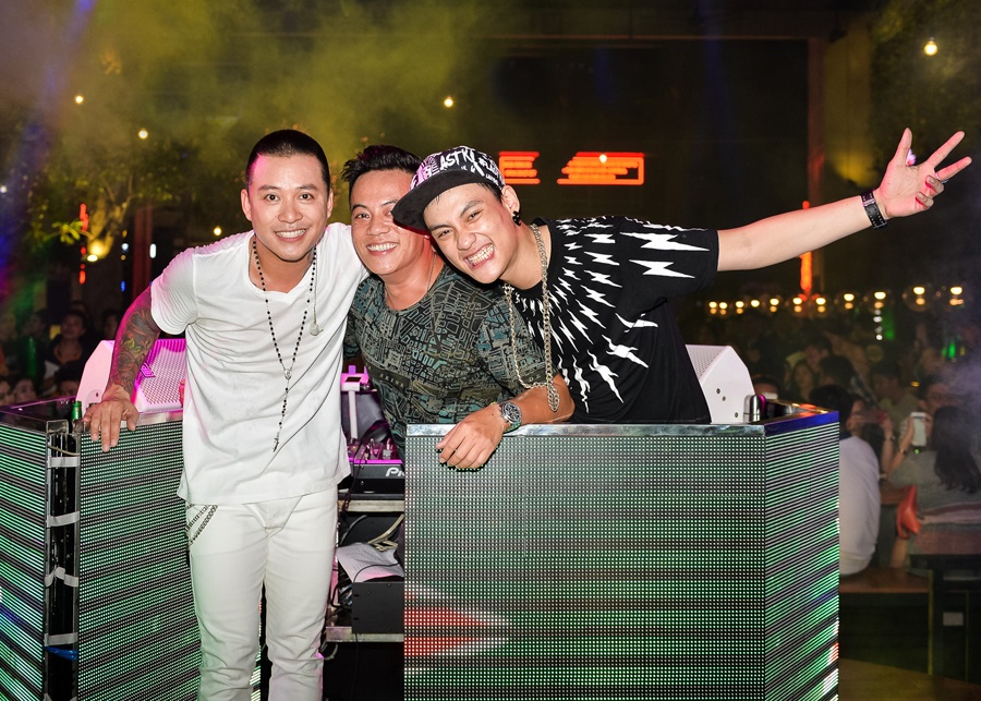 | Khi chương trình kết thúc, nam ca sĩ nán lại chụp ảnh cùng nhạc công, DJ Hoàng Anh - giám khảo The Remix 2015. |