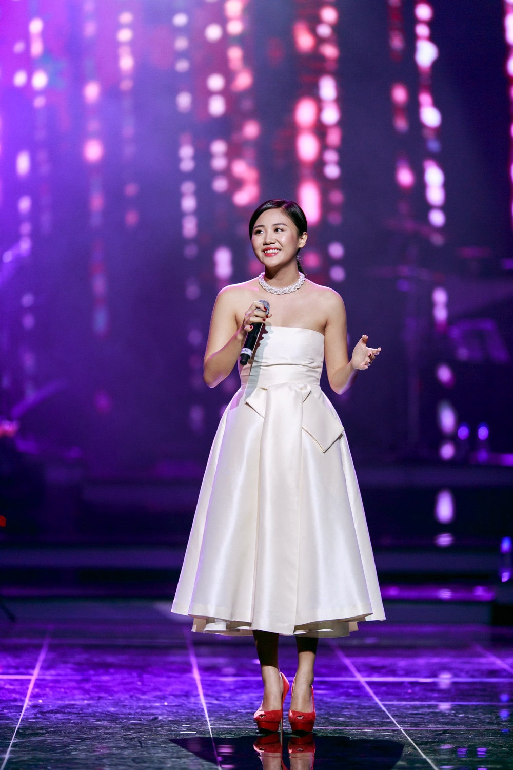 | Văn Mai Hương xuất hiện xinh xắn trên sân khấu với váy trắng xếp ly nữ tính. |