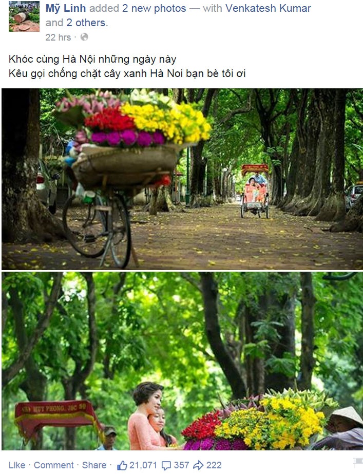 | Mỹ Linh kêu gọi mọi người giữ lại hàng cây xanh Hà Nội. |