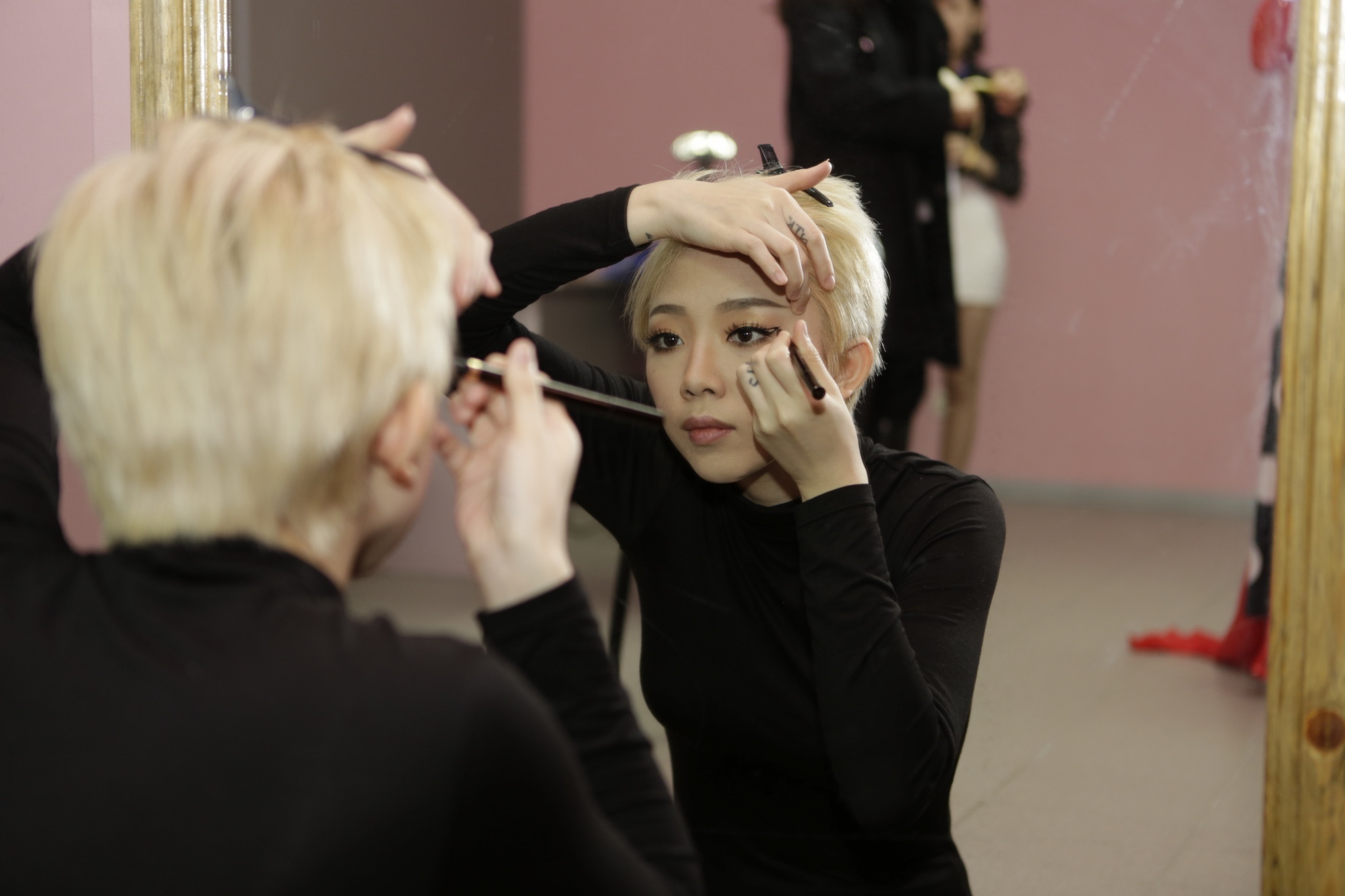 | Nữ ca sĩ trẻ tự make-up phía sau hậu trường. |