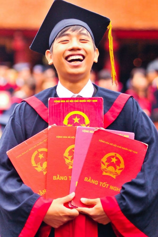 | Tuấn Tiền Tỉ - với nụ cười đặc trưng - trong chiếc áo cử nhân của học viện Ngân hàng. |