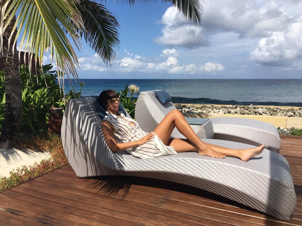 Người đẹp thư thái tắm nắng, tận hưởng những làn gió biển mát trong. |