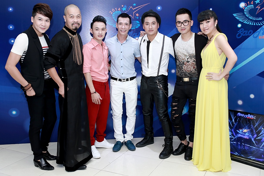 | Nhà thiết kế Thùy Dương, Hà Duy, Đức Hùng chụp ảnh cùng các ca sĩ và ê-kíp thực hiện chương trình. |
