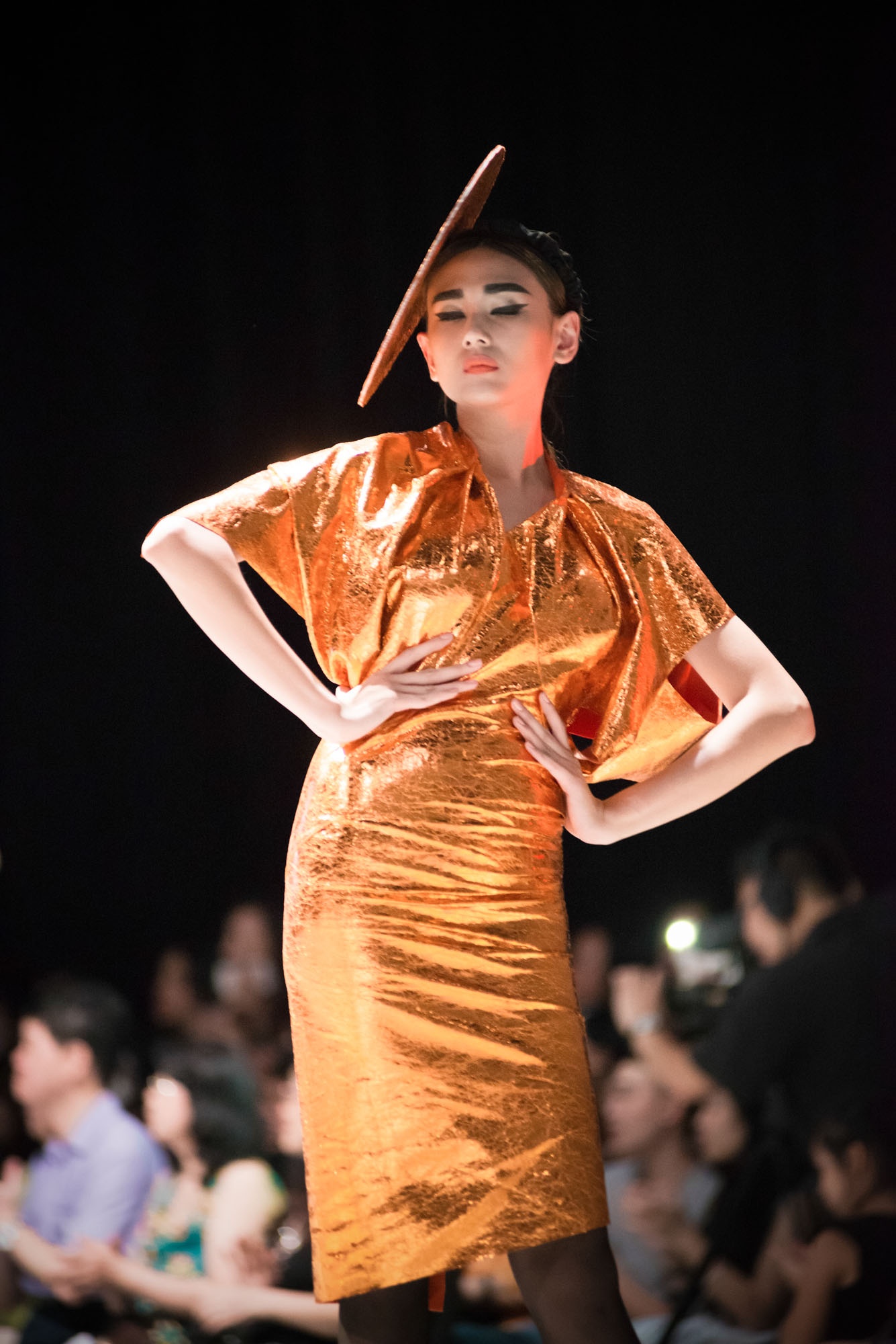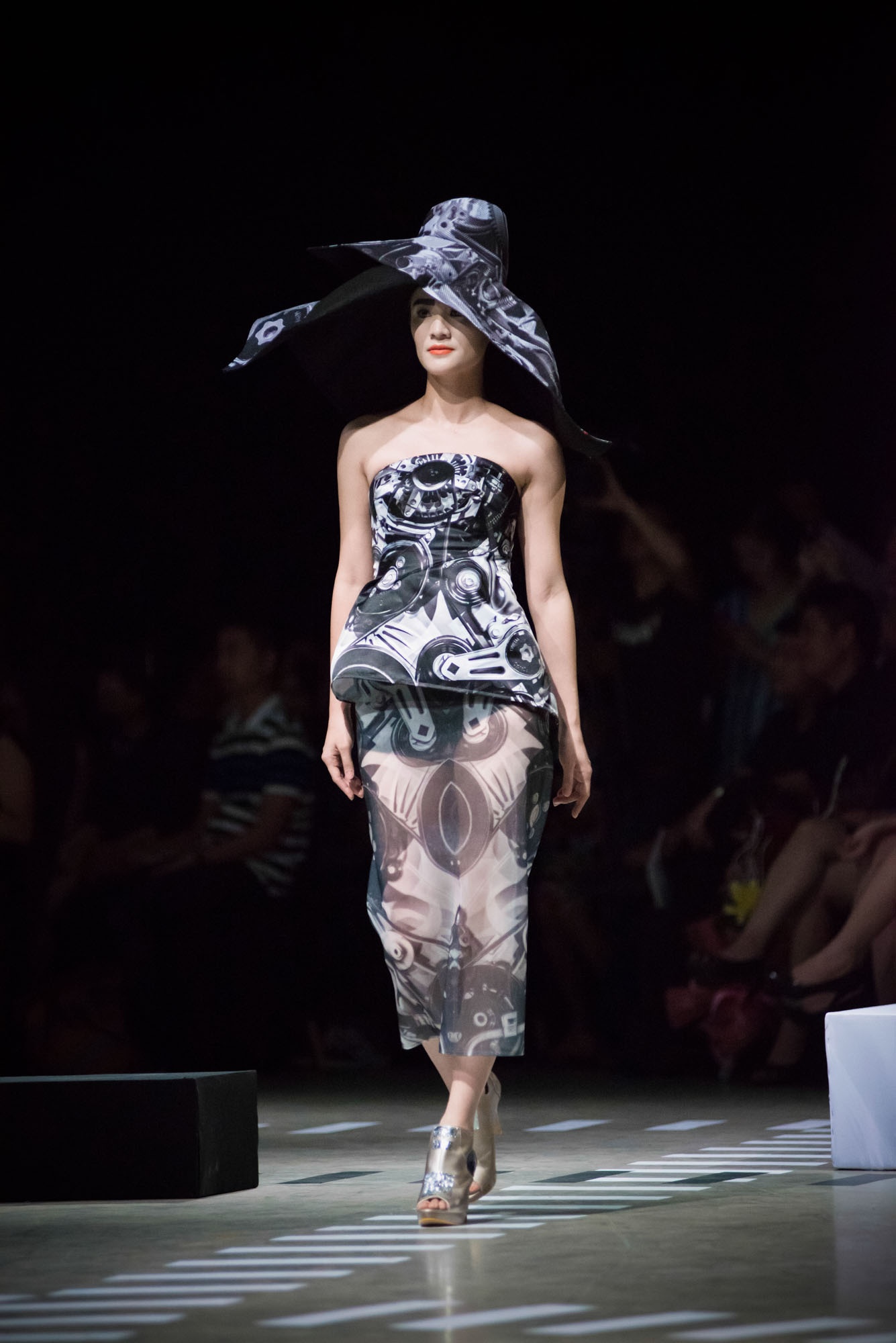 Trang phục do Tùng Dương thể hiện khá lạ lẫm với phong cách in đậm hình ảnh truyền thống, nhưng được xử lý khôn khéo bằng những đường cắt hiện đại, mang tính ứng dụng cao.