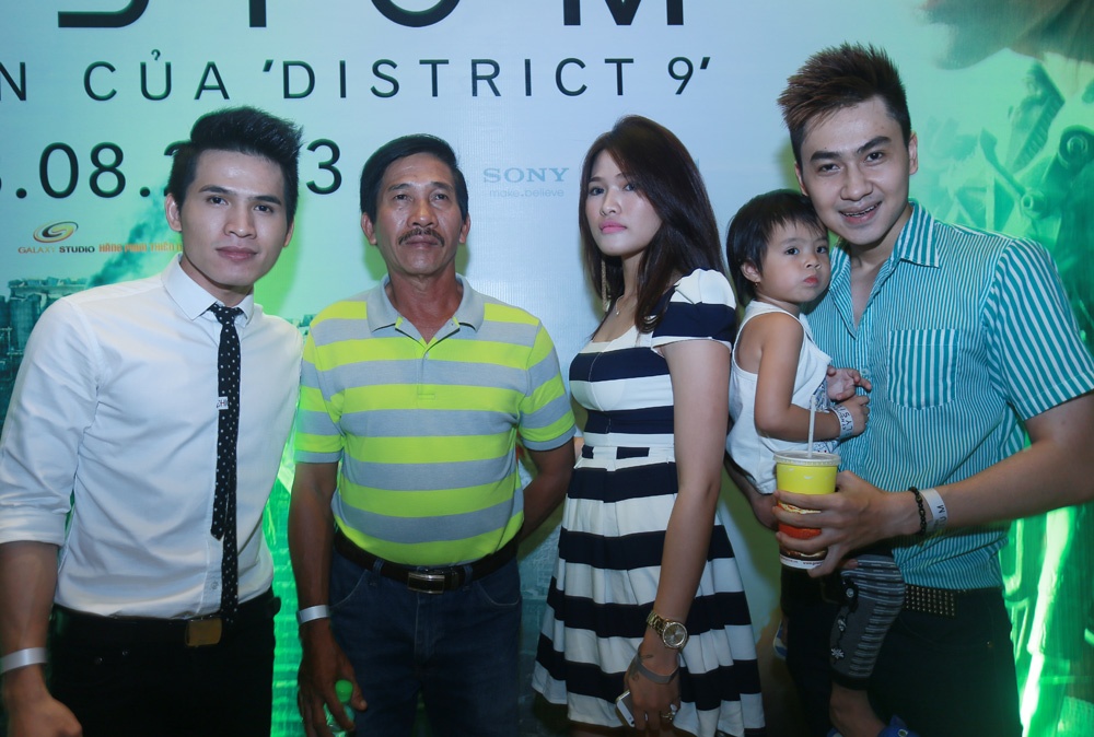 | Tùng Lâm chụp hình cùng gia đình Quốc Thiên. Bố và em gái của nam ca sĩ Chia cách bình yên cùng anh tham gia buổi ra mắt phim này. |
