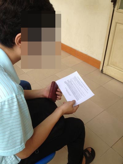 | Một nam sinh đọc cam kết trước khi để người yêu phá thai tại BV Phụ sản Trung ương. |