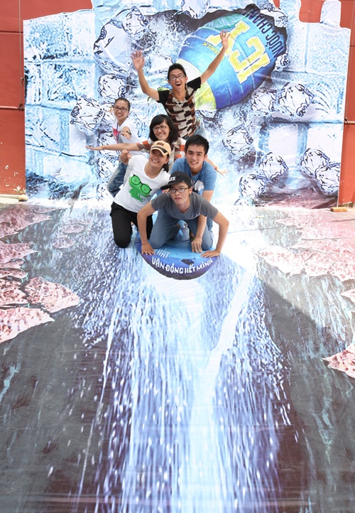 Từ 8h30, hàng trăm gương mặt trẻ trung, năng động đã có mặt tại khu vực khán đài, háo hức hòa mình cùng tinh thần “yêu vận động” đang hừng hực nơi đây. Một số bạn đã kịp dừng lại tranh thủ chụp ảnh cùng những bức tranh 3D ấn tượng: trượt skateboard, lướt ván, trượt thác nước... Ai cũng muốn có bức ảnh độc ghi lại khoảnh khắc thể thao mạo hiểm của riêng mình.