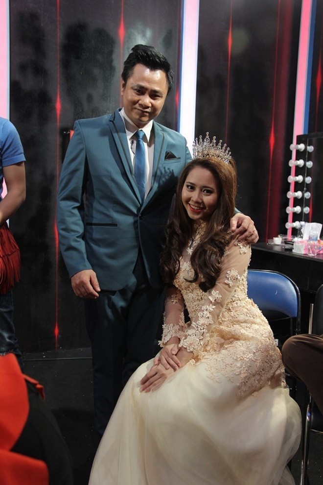 | Tường Vi chụp ảnh cùng trưởng phòng Tự Long trong hậu trường. |