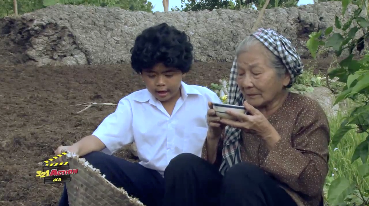 | NSƯT Phương Điểu trong vai người bà chăm sóc đứa cháu nhỏ trong phim ngắn Máy bay, phim ngắn tham dự vòng sơ khảo cuộc thi 3, 2, 1 Action 2015. |