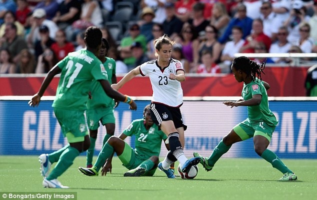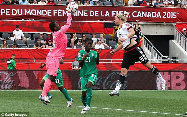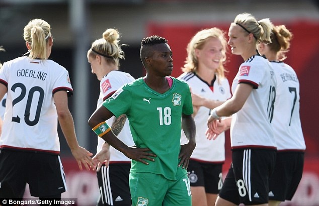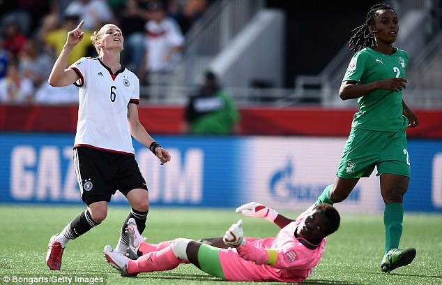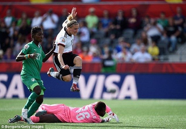 | ĐT nữ Đức còn có thêm hai bàn của Mittag trước khi hiệp 1 khép lại. Sau 45 phút đầu, nhà vô địch World Cup năm 2007 dẫn trước tuyển Bờ Biển Ngà với cách biệt 5 bàn. |
