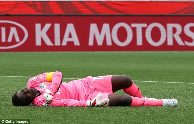| Thủ môn Thiamale của Bờ Biển Ngà dính chấn thương và cần tới sự chăm sóc của các nhân viên y tế. |