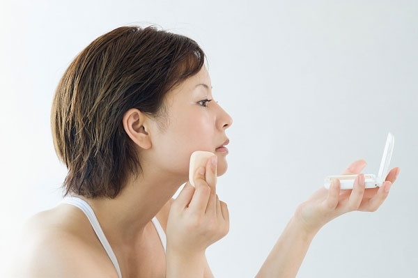 Lấy một lượng nhỏ phấn chấm lên 4 điểm ở trán, cằm và hai bên má. Nhẹ nhàng dùng tay hoặc miếng bông trang điểm tán đều từ trong ra ngoài, từ trên xuống dưới. Chú ý, không nên đánh dày hai bên cánh mũi và khoé miệng để tránh tình trạng mốc trắng.