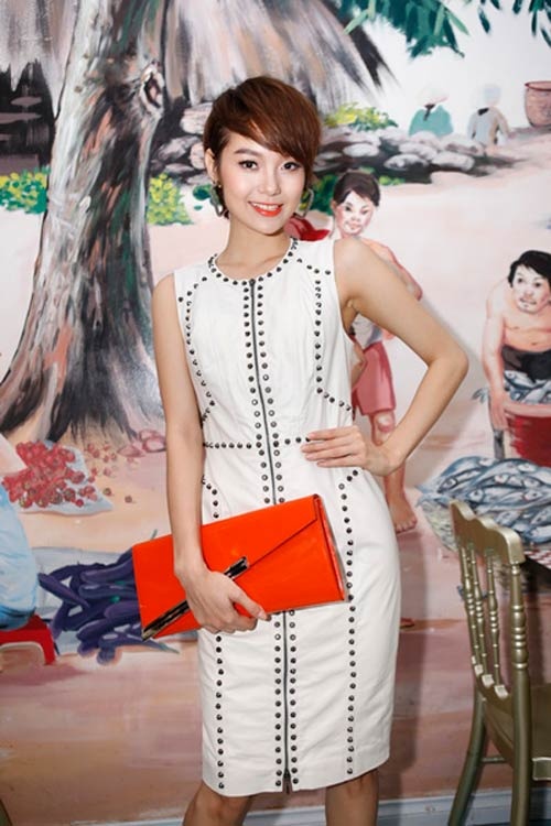 | Sự khéo léo kết hợp với đinh tán giúp tăng vẻ mạnh mẽ cho mẫu đầm trắng, một gợi ý hấp dẫn khi mix kèm kiểu tóc cá tính của Minh Hằng. |