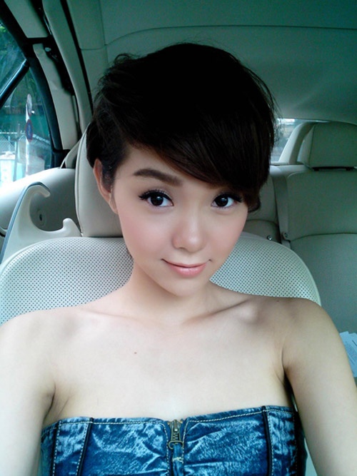 Màu son hồng đáng yêu cũng giúp tăng vẻ dễ thương cho mái tóc ngắn của Minh Hằng.