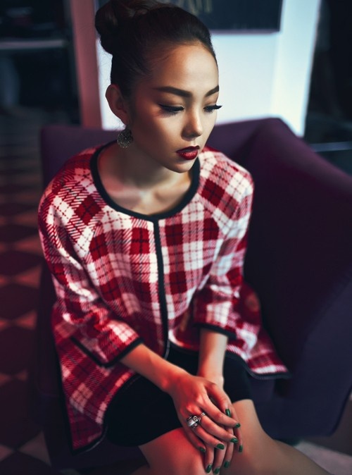 Khi muốn tăng vẻ sexy, cô chọn cách vuốt tóc cao ngược ra phía sau để khoe gương mặt sáng.