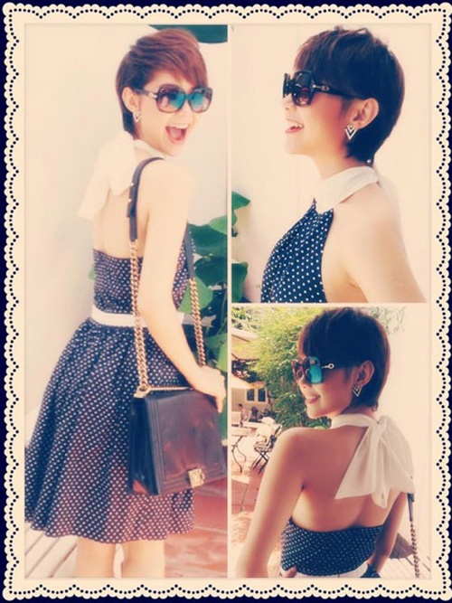 Có lúc cô lại chọn vẻ đẹp cổ điển với kiểu đầm chấm bi ngọt ngào.