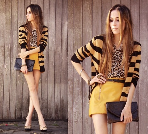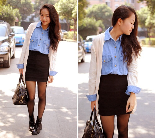 Phong cách khỏe khoắn với sơ mi, chân váy ôm và cardigan mỏng.