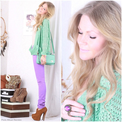 Cardigan bạc hà mix khéo léo cùng skinny màu tím lavender.