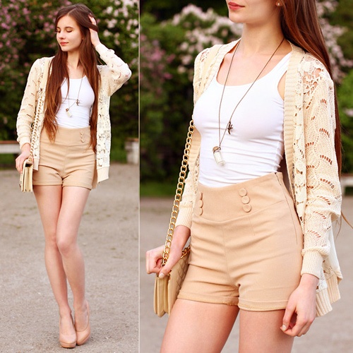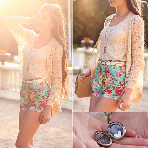 Nếu thích quần short hoa, bạn nên chọn cardigan có tông màu be, trắng nhẹ nhàng.