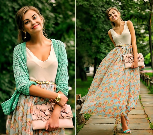 Cardigan bạc hà mát mắt mix kèm chân váy in hoa lãng mạn cho ngày thu.