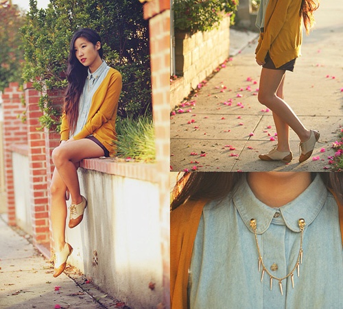 Phong cách đậm chất thu với giày oxford, sơ mi denim, short ngắn và cardigan vàng sậm.