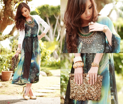 Cardigan cho cô nàng tiệc tùng với phụ kiện án kim, váy maxi tha thướt và áo cài cúc trắng mỏng.