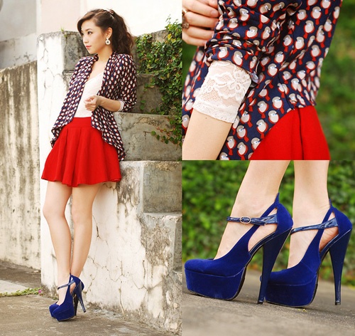 Cardigan hoa văn mix ăn ý với đầm xòe và giày xanh royal.