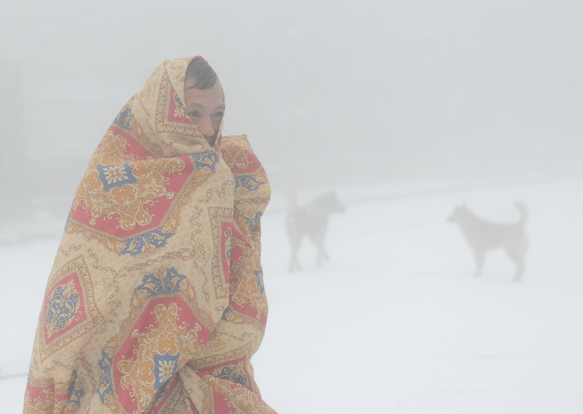 Anh Minh ở Bắc Giang đang trùm chăn đi trong tuyết lạnh do chủ quan không mang nhiều quần áo. "Hôm nay thấy có tuyết, tôi muốn ra xem nhưng lạnh quá nên phải quấn chăn vào", anh vừa nói vừa run. |