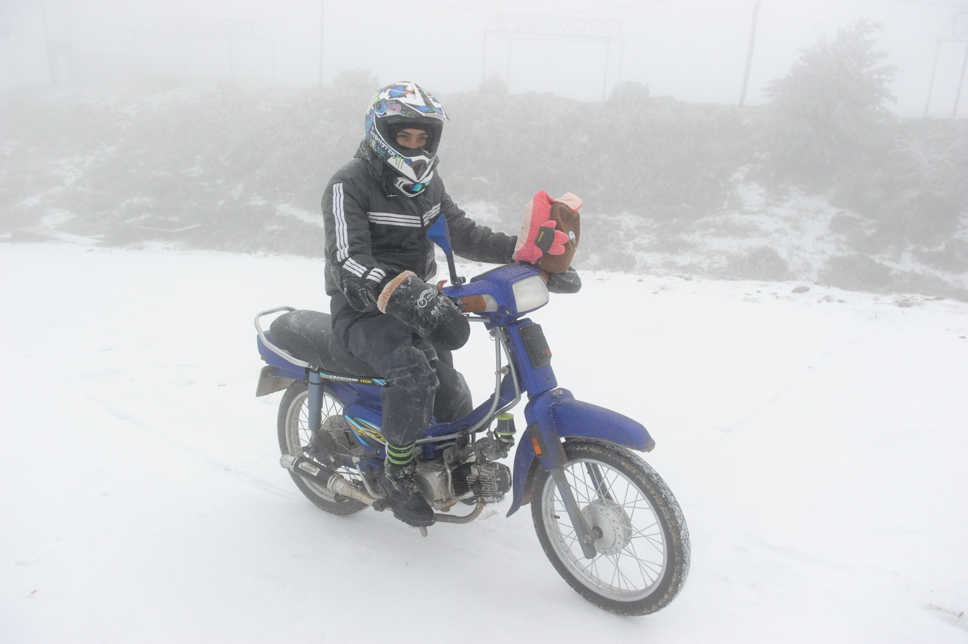 Nhận được tin có tuyết, nhiều bạn trẻ đã chạy xe máy lên đỉnh Mẫu Sơn. Tuy nhiên tuyết phủ dày khiến việc đi lại gặp nhiều khó khăn. |