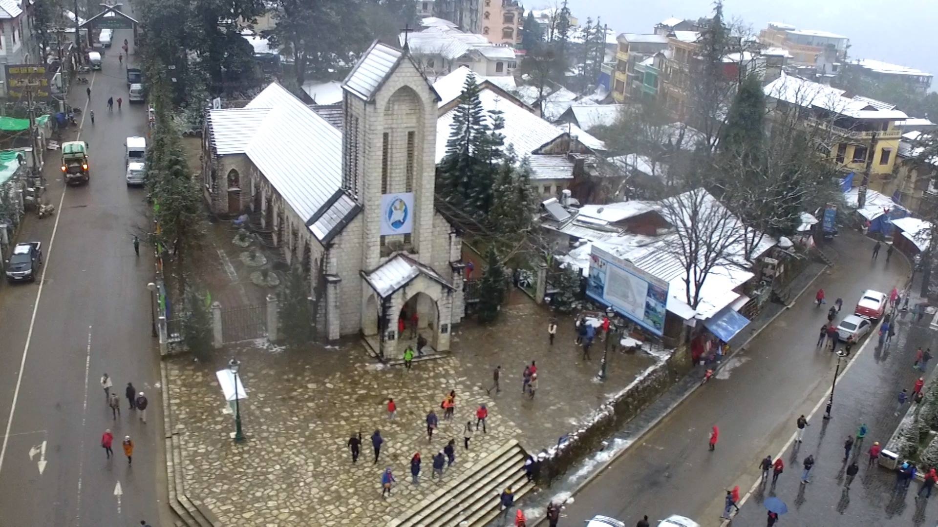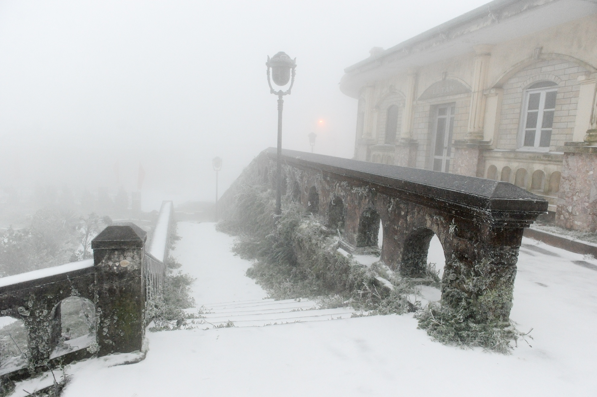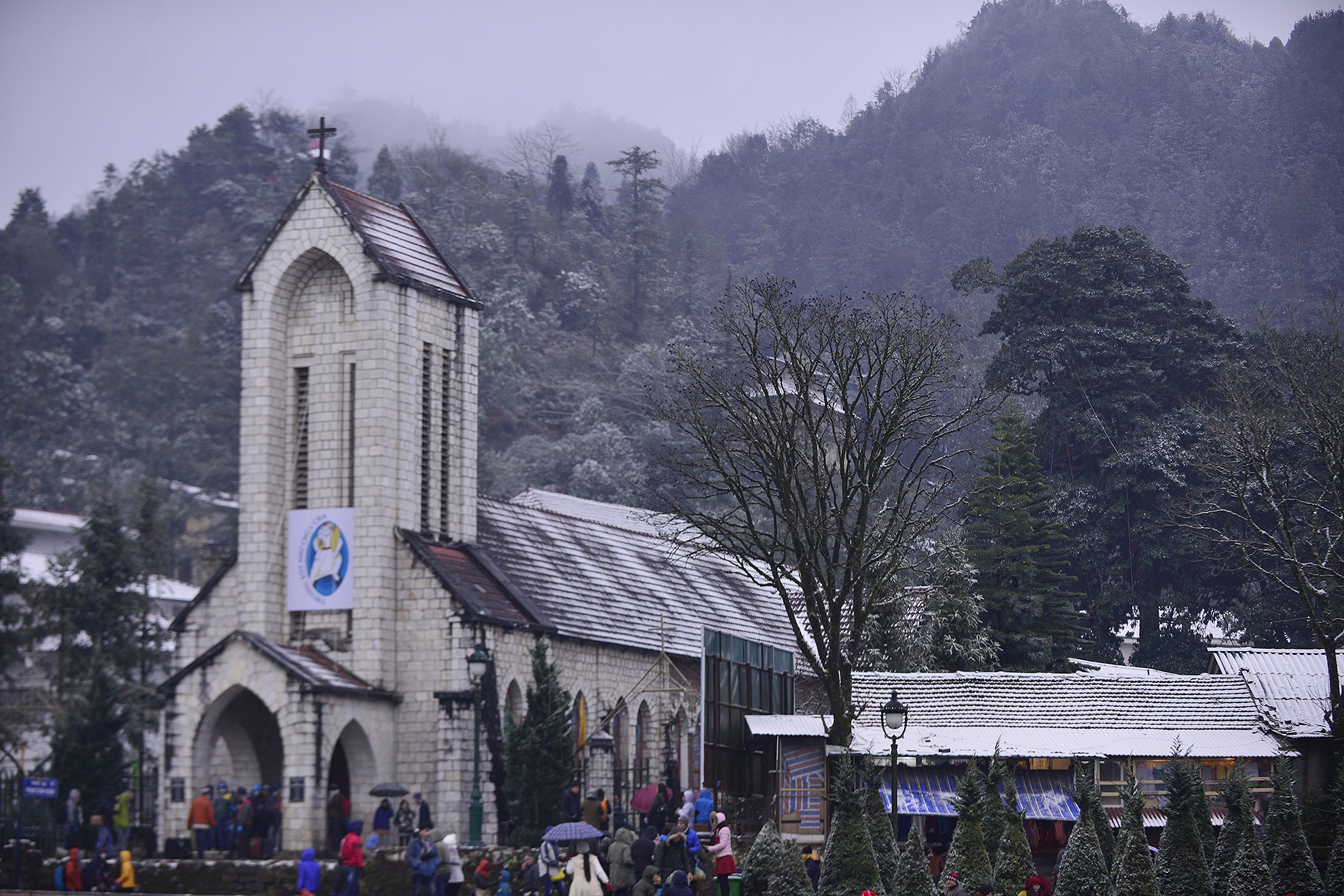 Tại nhà thờ chính, tuyết phủ trắng hai bên mái nhà. Xa xa là đỉnh Hàm Rồng mù sương, hàng cây cũng trắng xóa do tuyết phủ. |