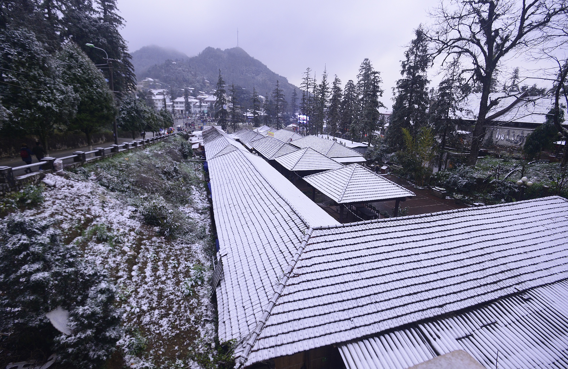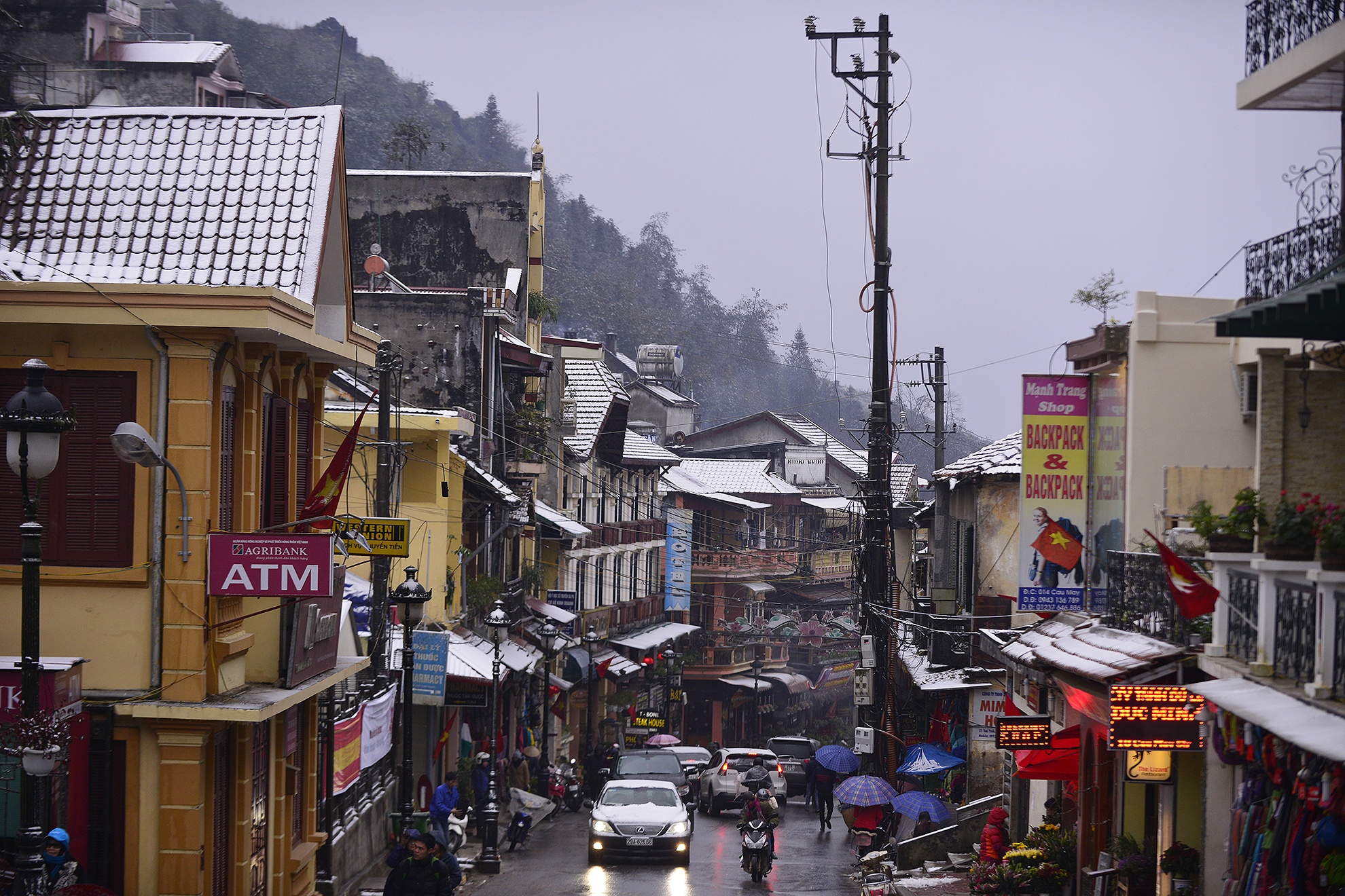 Phố Thạch Sơn, Cầu Mây... nhộn nhịp khách qua lại. Nhiều ngôi nhà có từ thời Pháp cổ trở nên lung linh hơn với màu trắng của tuyết. |