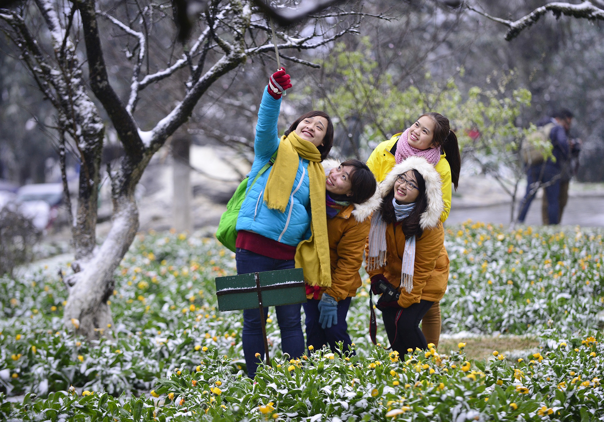 Nhiều bạn trẻ lên Sa Pa từ thứ 7 may mắn được chứng kiến cảnh tuyết rơi và không quên chụp ảnh kỷ niệm bên những vườn hoa đầy băng tuyết. |