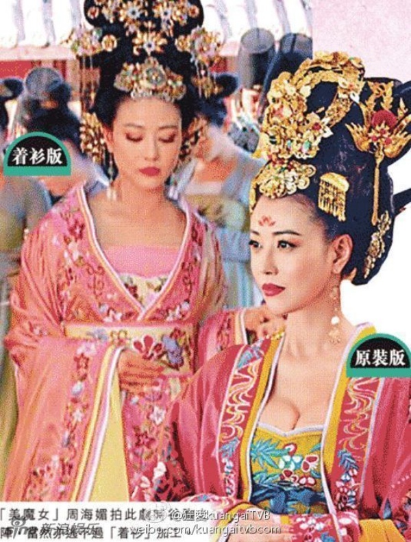 | Đài TVB không sử dụng phương pháp cắt cảnh để che ngực, thay vào đó, đài này quyết định sử dụng kỹ thuật máy tính để chế thêm vải vóc cho các nhân vật trong phim. Sina miêu tả: "Không phải bản phim khoe ngực hở hang, càng không phải đầu to con nít vì mất cảnh ngực mà là thêm vải trước ngực. TVB đã thuê ê kíp chuyên nghiệp để chỉnh sửa sao cho màu sắc y phục tạo ra tương tự với váy nguyên gốc của nhân vật. Một chút cũng khó nhận ra là chỉnh sửa vi tính mà thành". |