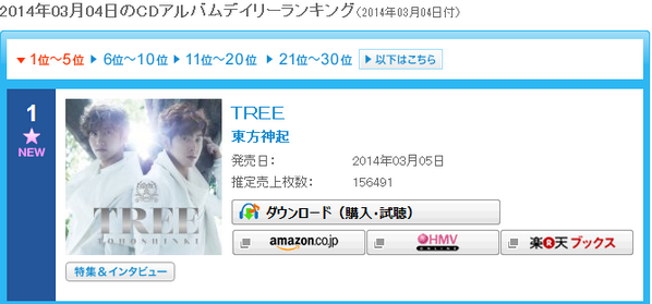 Trang Ohkpop đưa tin, album tiếng Nhật Tree mới ra lò ngày 5/3 của TVXQ đã nắm giữ ngôi vị đầu bảng BXH album hàng ngày của Oricon. Con số 156.491 bản bán chỉ trong ngày đầu phát hành đã chứng minh độ nóng của bộ đôi ở Nhật không hề sụt giảm.