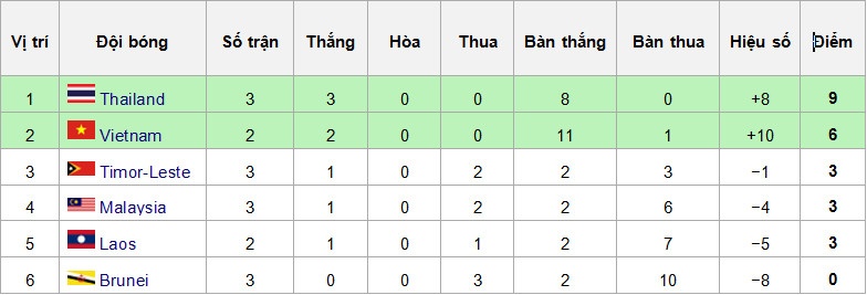 | Cục diện bảng B sau cuộc so tài giữa U23 Thái Lan và U23 Malaysia. |