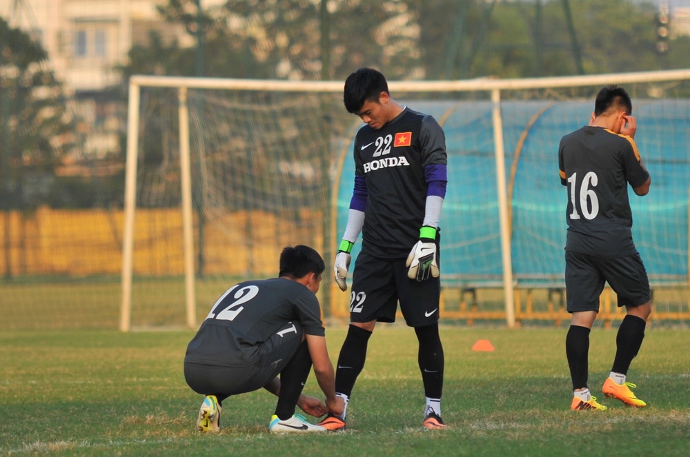 | Cử chỉ nhỏ thể hiện tình đoàn kết ở ĐT U23 Việt Nam. Ảnh: Thủ môn Nguyên mạnh được đồng đội giúp buộc lại dây giày. |