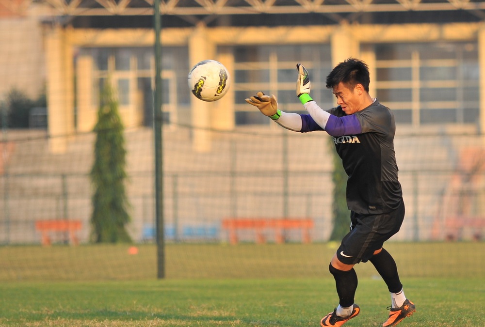 | Thủ môn Nguyên Mạnh liên tiếp phải chịu những pha dứt điểm mạnh và hiểm hóc từ các đồng đội. |