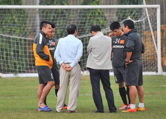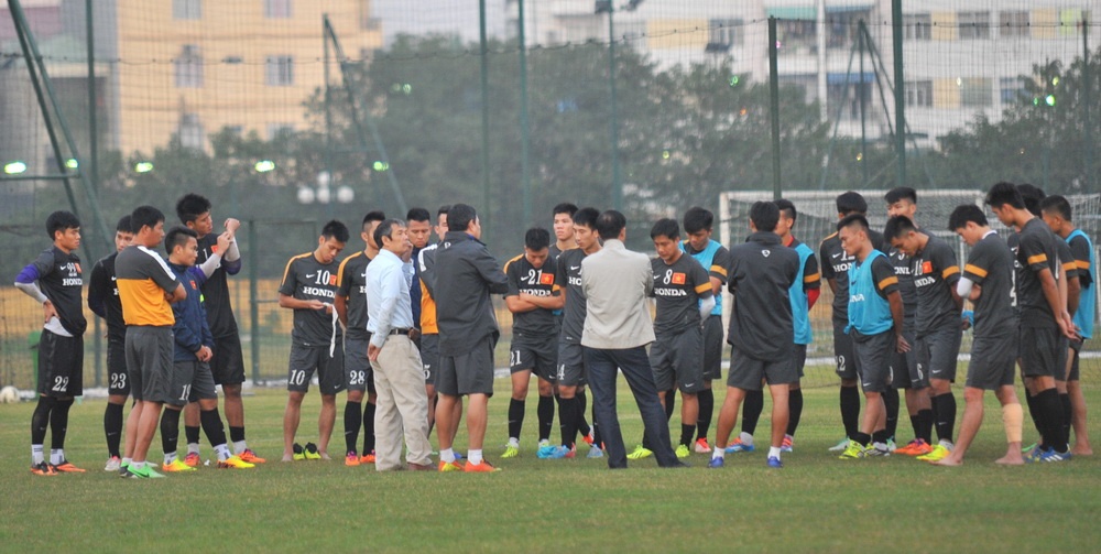 | Lãnh đạo VFF tổ chức họp ngắn và động viên toàn đội ngay tại sân sau buổi tập. |